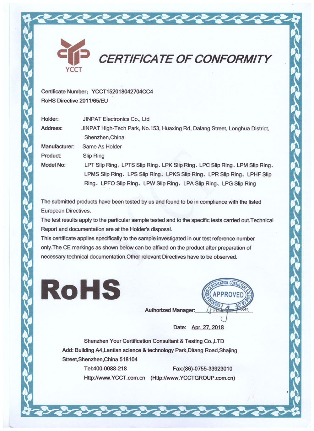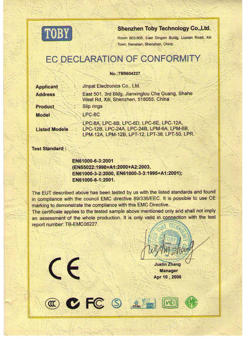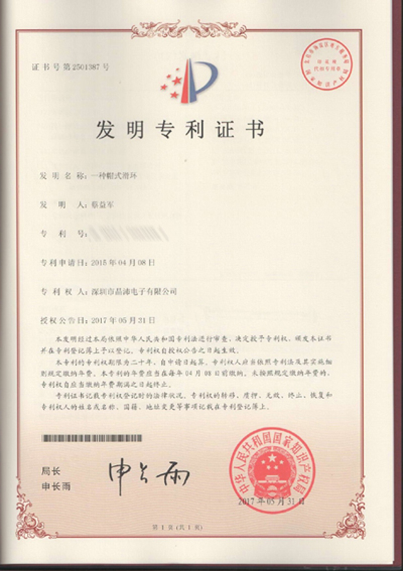 晶沛通過(guò)了歐盟CE認(rèn)證一无是处(什么优点都没有)、FCC認(rèn)證一见钟情、SGS認(rèn)證因祸得福、BV“船級(jí)社”認(rèn)證、防爆認(rèn)證等多項(xiàng)認(rèn)證,生產(chǎn)的導(dǎo)電滑環(huán)都符合RoHS環(huán)保要求,先后被授予“國(guó)家高新技術(shù)企業(yè)”稱(chēng)號(hào),目前已獲得45項(xiàng)專(zhuān)利,其中發(fā)明專(zhuān)利6項(xiàng)。